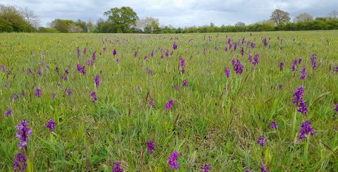 Over 60 species of flowering plants have been recorded, including yellow rattle, oxeye daisy, rough hawk's-beard, agrimony, meadow oat-grass and primrose. The speciality of the site is the uncommon green-winged orchid of which several thousand spikes are to be found in most years. Adder's-tongue also occurs.